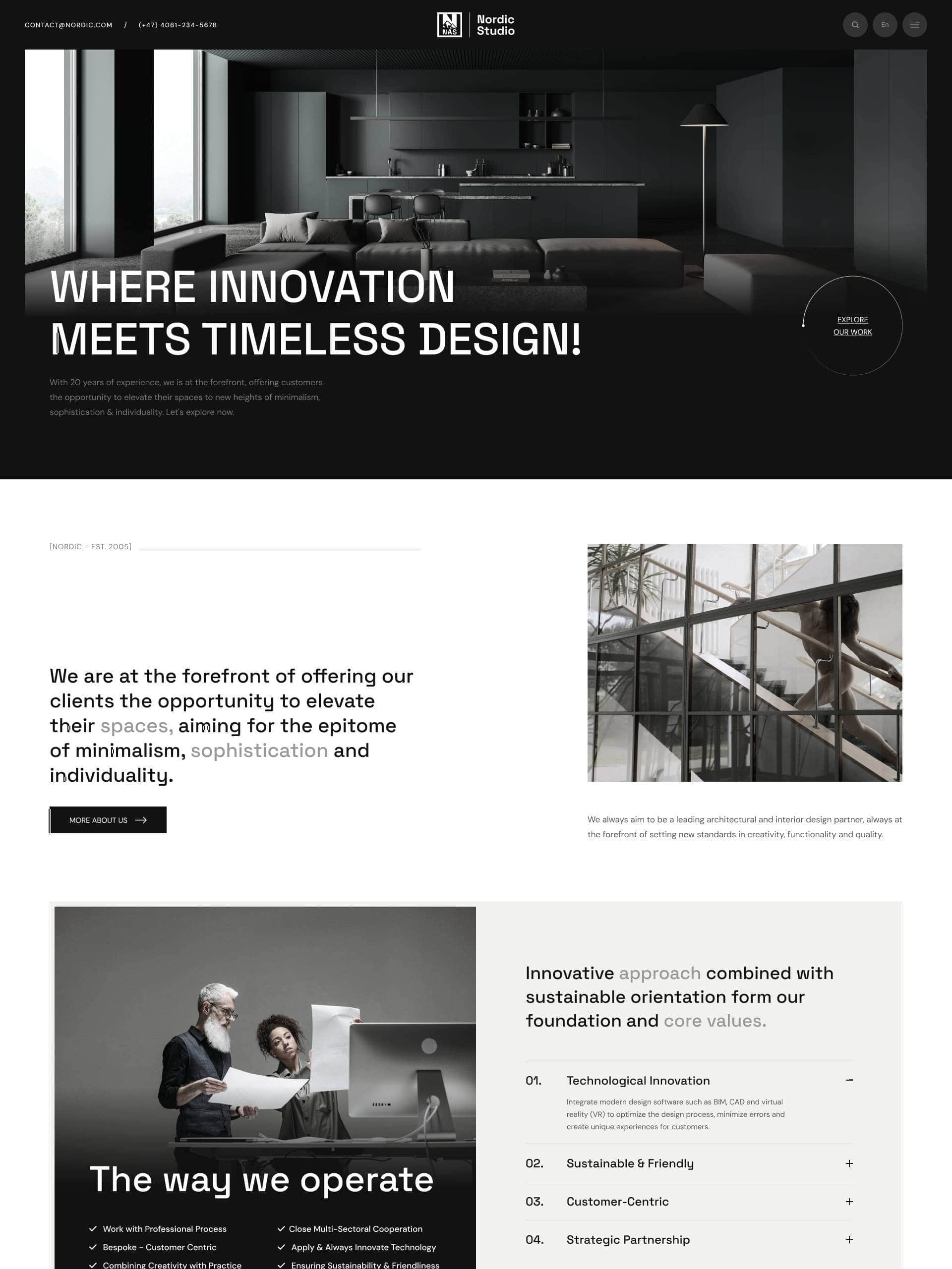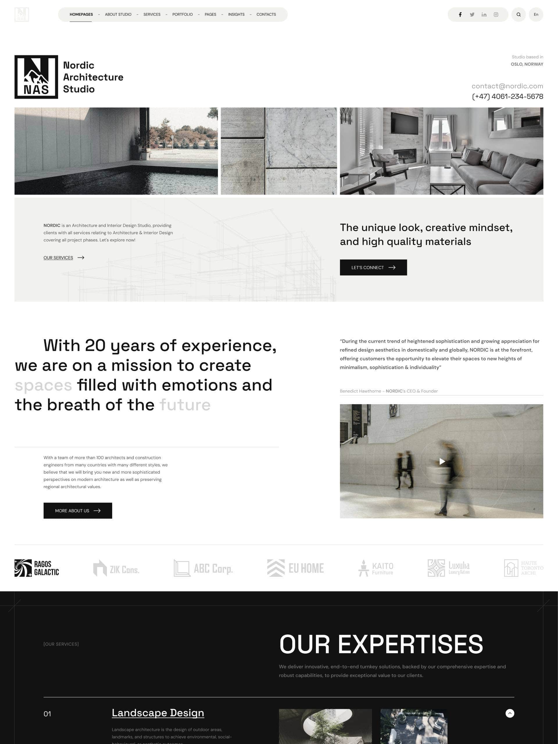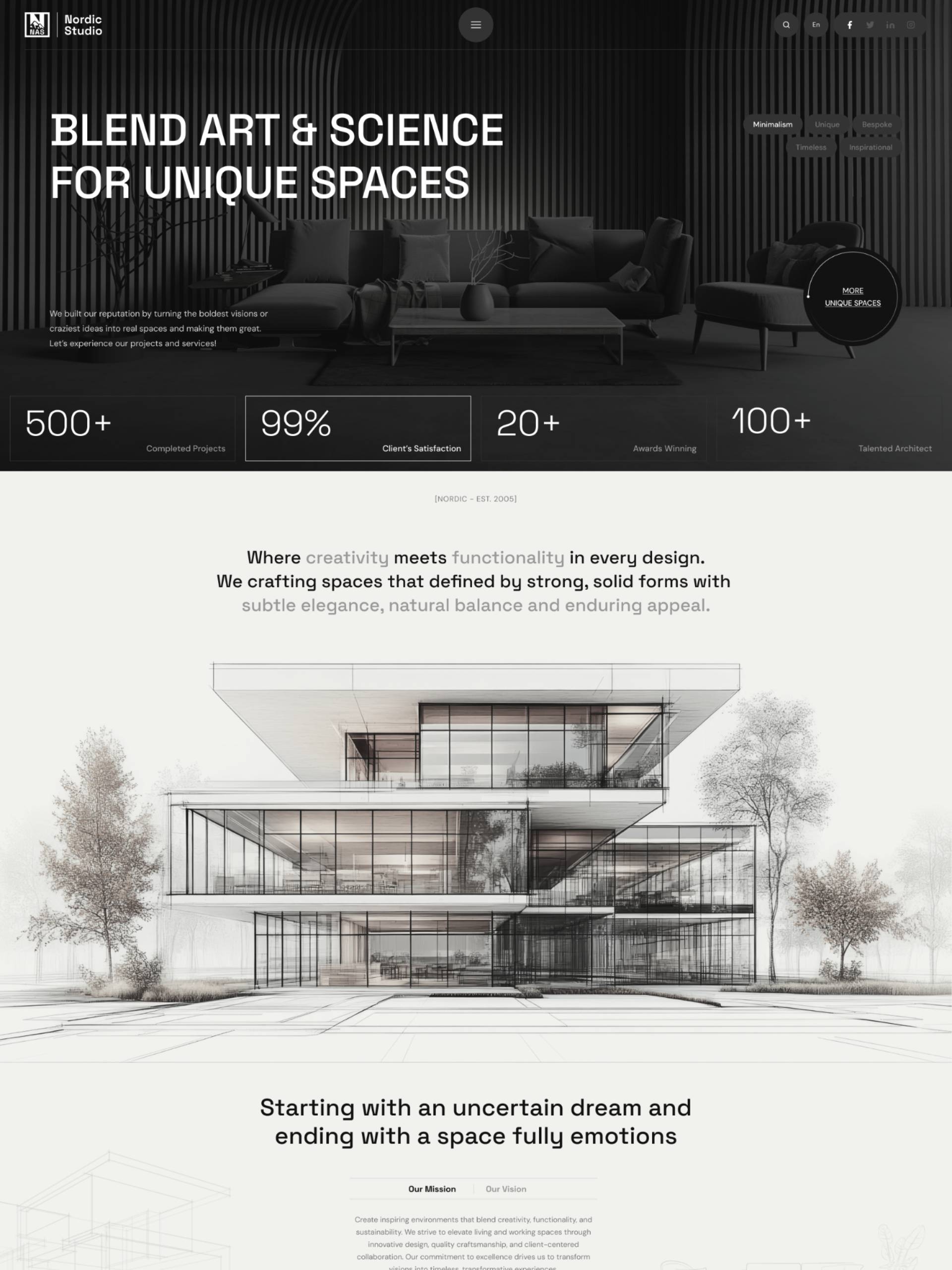 Refined homepage designs to kickstart your site. One-click setup, fully flexible to mix and match — crafted for architecture and interior studios with a focus on aesthetics, usability, and modern layout standards